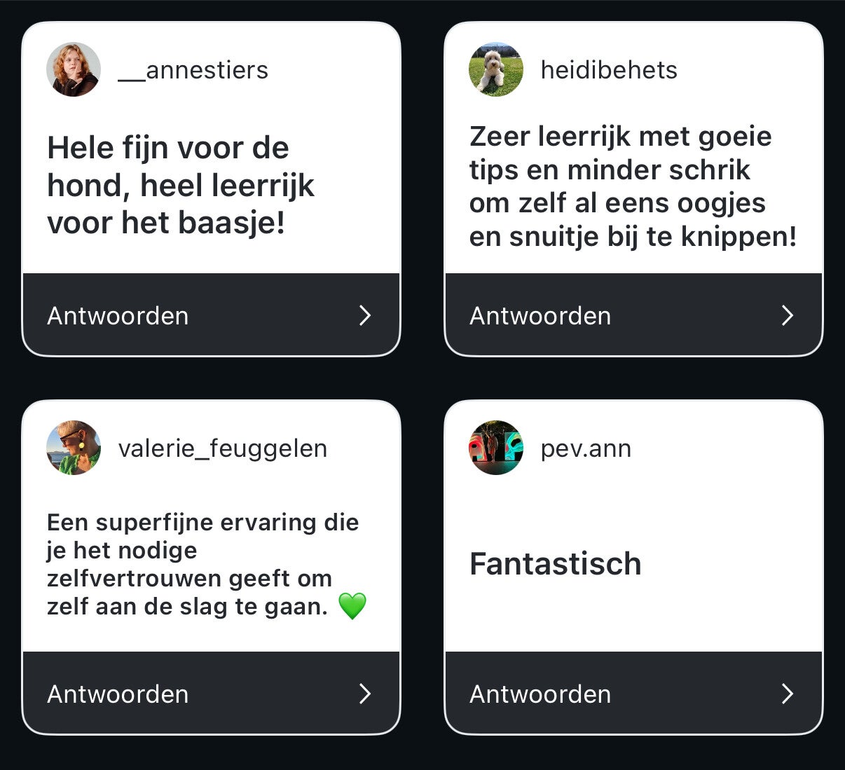 Ik volgde een workshop bij Jolien om mijn Cobberdog Lizzie zelf te leren trimmen. Ondanks eerdere pogingen ontdekte ik klitten die ik nooit had gezien! Jolien leerde me stap voor stap hoe ik haar op de juiste manier kan trimmen en gaf me het vertrouwen om het zelf te doen. En het mooiste? Ik weet dat ik altijd bij haar terechtkan voor advies!