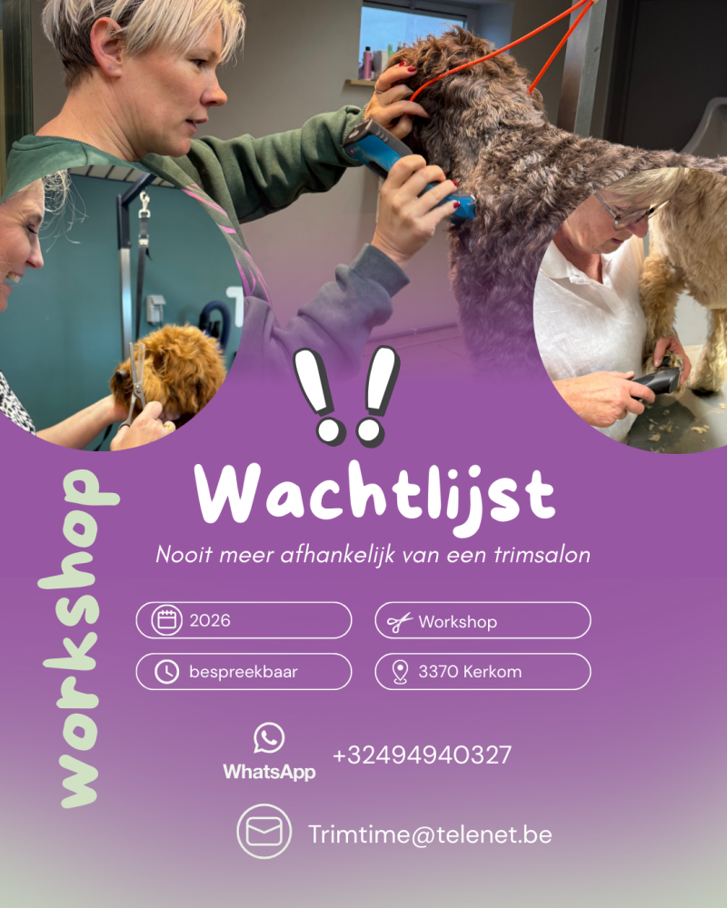 Wil je niet langer afhankelijk zijn van een trimsalon? Leer dan hoe je zelf de vacht van je Cobberdog of Doodle kunt onderhouden. Zo bespaar je niet alleen trimsalonkosten, maar hou je je hond ook het hele jaar door mooi verzorgd. Tijdens de workshop leer je wat jouw hond nodig heeft, hoe je de juiste technieken toepast en krijg je persoonlijke begeleiding om het meteen goed te doen. Zo ga je met vertrouwen naar huis en met een gelukkige, verzorgde hond.